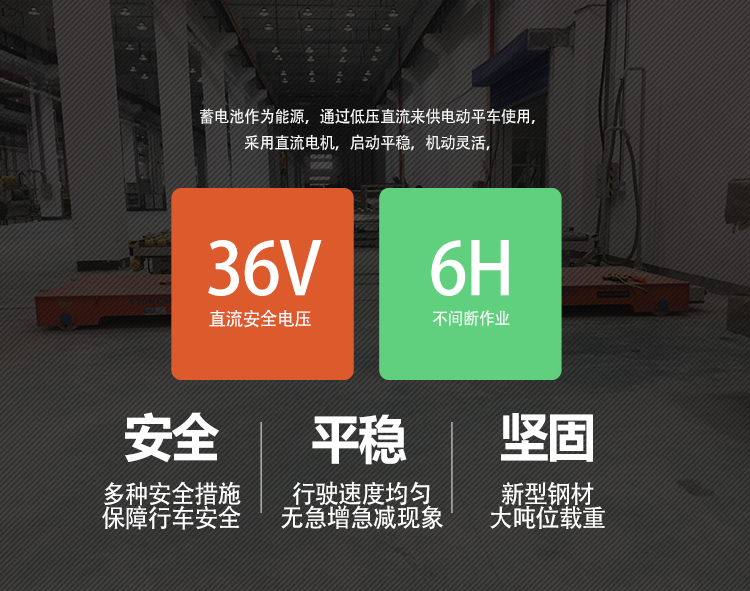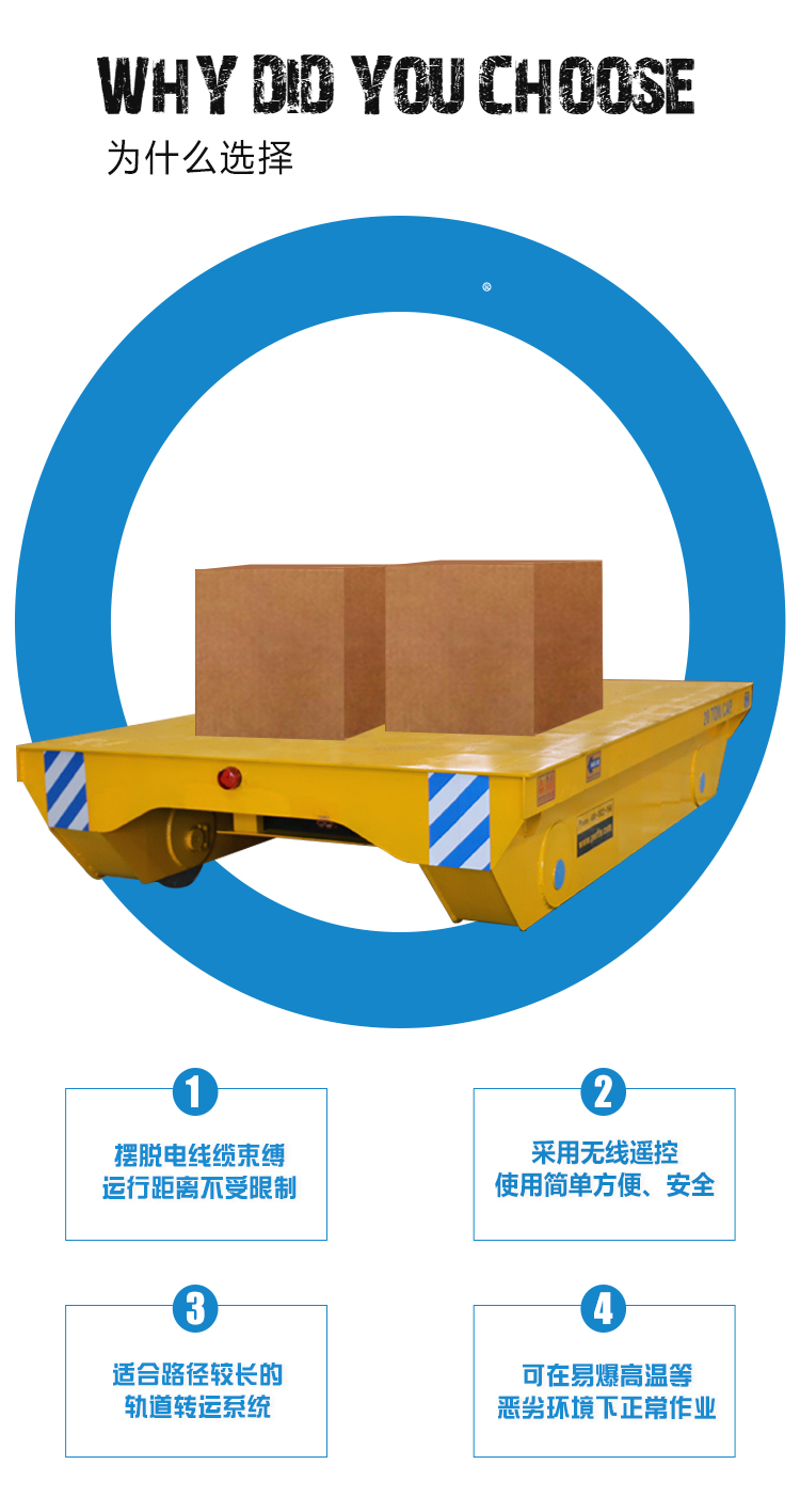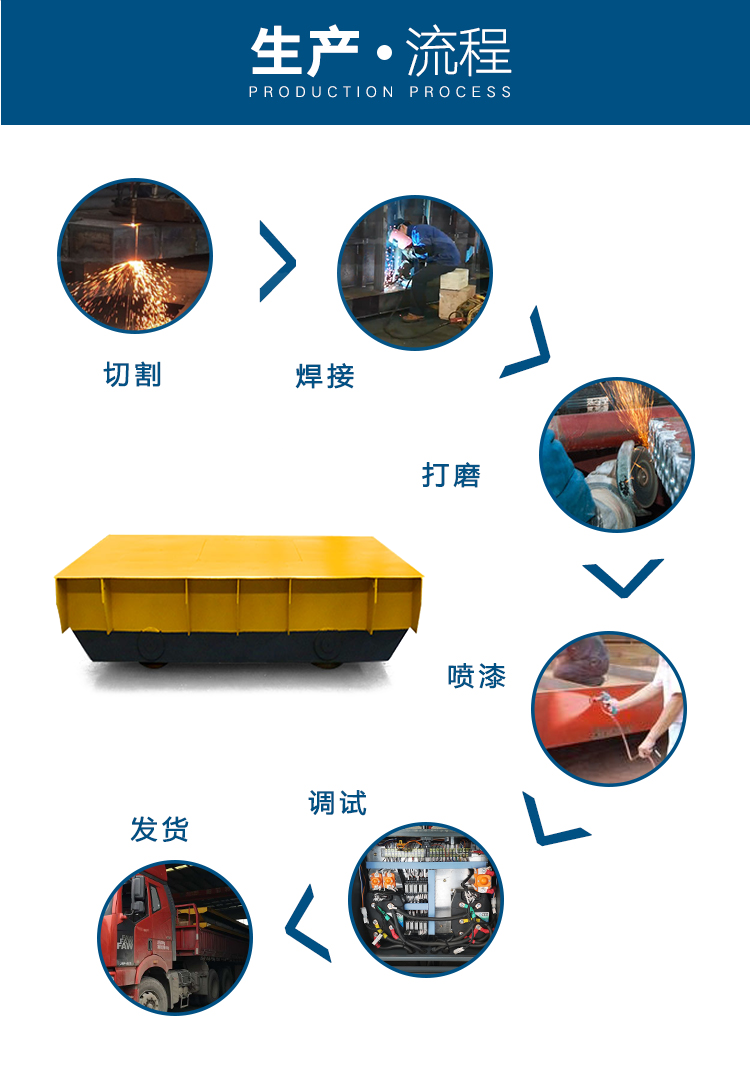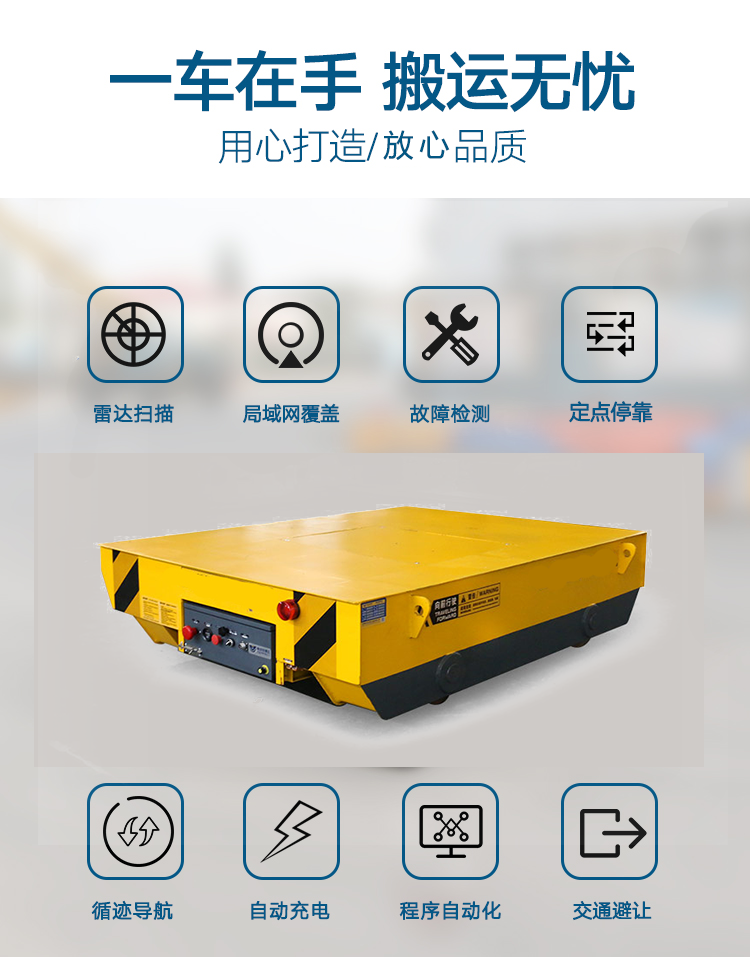 RGV:自動化軌道平車是一種以蓄電池作為電源,電機減速機作為驅動系統,鑄鋼車輪直接在軌道行走的轉運車,其運行不受限制,可以根據需求自動化對位,輥輪傳送,頂升,臺面旋轉等功能,載重能力1-200噸