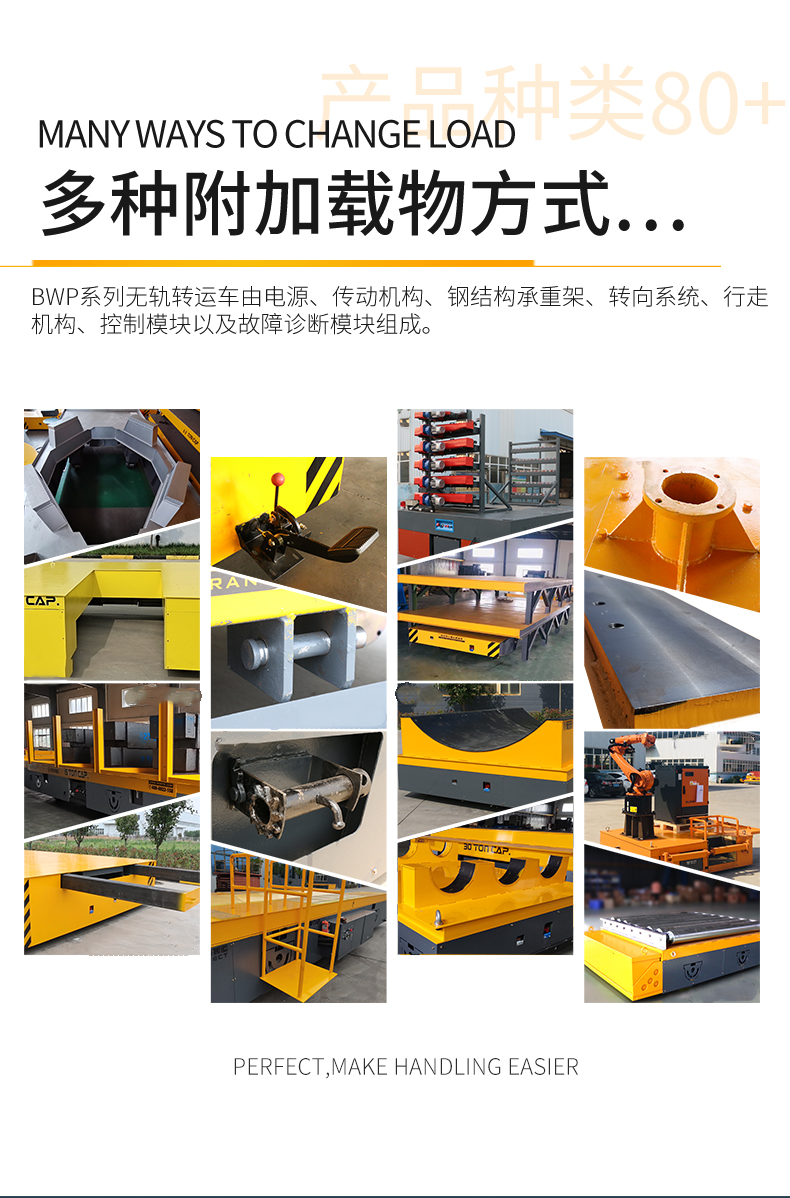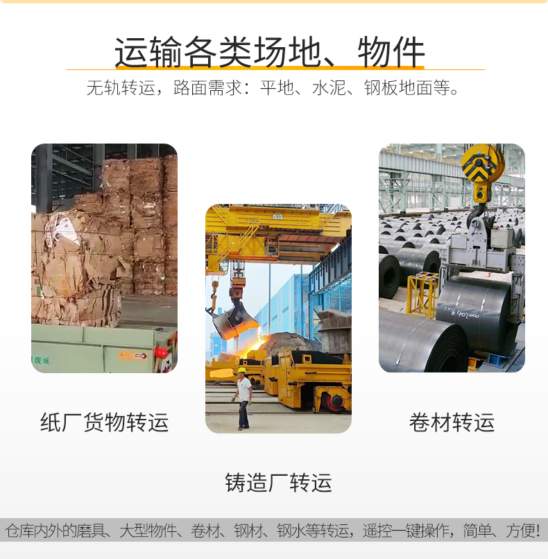 BZH型無軌搬運(yùn)車是一種以蓄電池或電纜為動(dòng)力源的車間內(nèi)運(yùn)輸車輛。又稱臺(tái)車、過跨車、地爬車。該車具有結(jié)構(gòu)緊湊、操作方便、可橫縱移動(dòng)、調(diào)速性能好及污染低、運(yùn)輸效率高等特點(diǎn)。該車型外形尺寸小,也可進(jìn)入空間小的倉庫、彎道完成物料運(yùn)輸,可減輕工人的勞動(dòng)強(qiáng)度,提高生產(chǎn)效率。作為短距離運(yùn)輸工具得到廣泛應(yīng)用,也可作為車間內(nèi)部配合吊車運(yùn)輸重物過跨之用。 該車型采用是一種以蓄電池或電纜為動(dòng)力源,電壓可有24V、36V、48V、72V、110V。一般蓄電池安裝在平車內(nèi)部,電源通過電氣控制系統(tǒng),給電機(jī)提供電力,使平車實(shí)現(xiàn)啟動(dòng)、